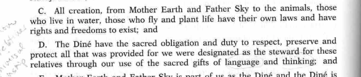 Though never directly linked to the 2002 Diné Fundamental Laws in the interview, you can see how the Navajo Nation views itself as a protector or guardian of a river that it holds sacred. In that sense, they are acting upon the Diné’s obligation to act on their sacred “duty to respect, preserve and protect all that was provided for we were designated as the steward.” The lawsuit and the quote from the Navajo Nation President reflect the concepts of natural law coming into play and being acted upon, even if they are not specifically mentioned.